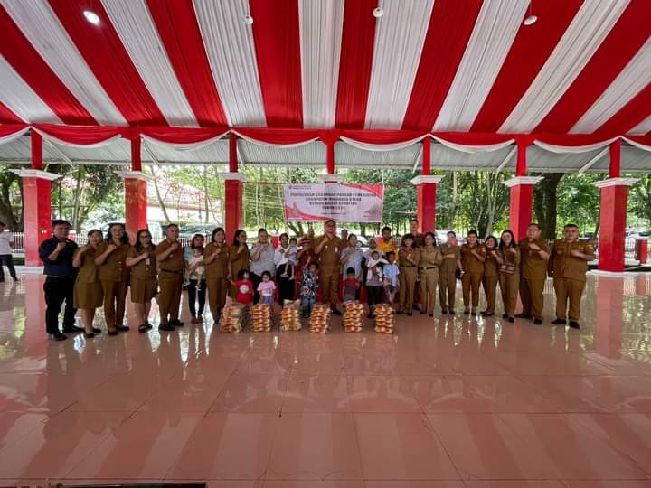 Pjs Bupati Reza Dotulung menyerahkan bantuan berupa beras premium seberat 10kg kepada setiap balita stunting yang ada di 10 Kecamatan se-Kabupaten Minahasa Utara.