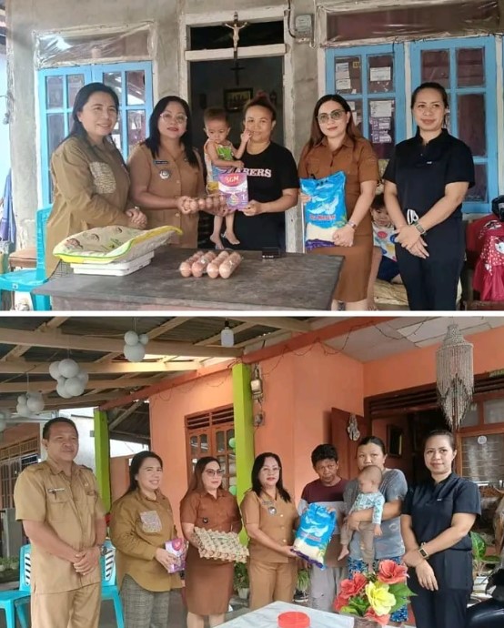 Liputan di lapangan menunjukkan bagaimana pendekatan ini mulai diterapkan di tingkat desa. Di Desa Kaima, Kecamatan Kauditan, dua anak berisiko stunting — Nathania Nelwan dan Given Rundengan — menerima bantuan makanan tambahan dari Bupati Joune Ganda yang bertindak sebagai orang tua asuh mereka.