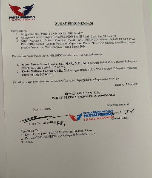 “Rekomendasi dari Partai Perindo adalah penegasan atas kredibilitas dan komitmen Joune Ganda dan Kevin William Lotulung sebagai calon Bupati dan Wakil Bupati Minahasa Utara,” ujar Joune Ganda.