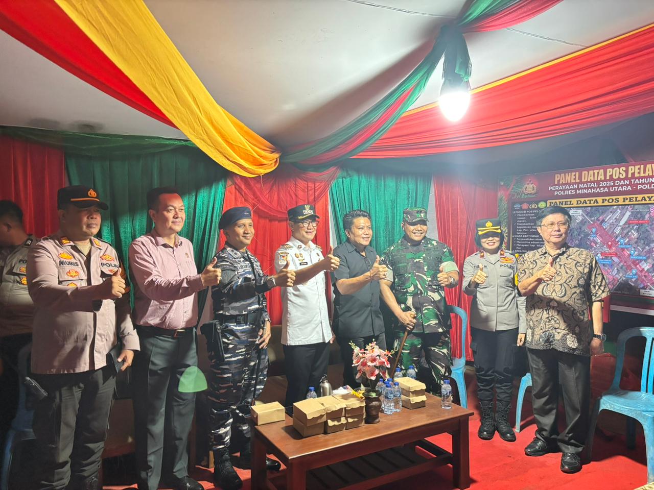 Gambar: Bupati Minahasa Utara Joune Ganda bersama Forkopimda saat meninjau Pos Pengamanan Natal dan Tahun Baru di wilayah Airmadidi dan Zero Point Sukur, Rabu, 24 Desember 2025. Foto: Denny.