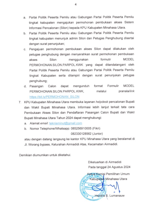 IKNews, MINUT – Komisi Pemilihan Umum (KPU) Kabupaten Minahasa Utara (Minut) resmi mengumumkan jadwal pendaftaran pasangan calon Bupati dan Wakil Bupati untuk Pilkada 2024. Pengumuman ini dikeluarkan berdasarkan ketentuan Pasal 95 ayat (1) Peraturan KPU Nomor 8 Tahun 2024 tentang Pencalonan Kepala Daerah.