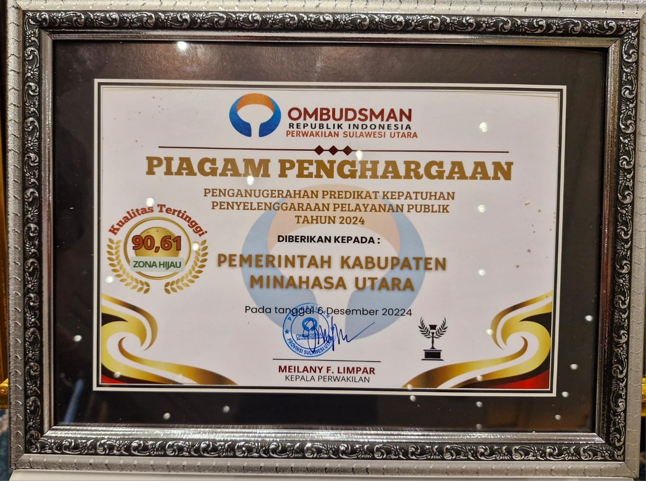 Terbaru, Pemkab Minut menerima penganugerahan predikat kepatuhan penyelenggaraan pelayanan publik oleh Ombudsman RI Tahun 2024 untuk Kabupaten/Kota, Kategori A (Zona Hijau) Opini ( Kualitas Tertinggi) dengan nilai 90,61 dan menempati urutan ke-4 Tingkat Provin di Sulut.