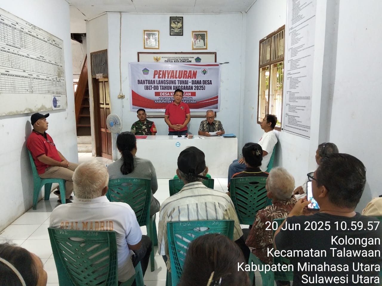 IKNews, MINUT – Pemerintah Desa Kolongan, Kecamatan Talawaan, Kabupaten Minahasa Utara, menyalurkan Bantuan Langsung Tunai Dana Desa (BLT-DD) tahap I tahun 2025 kepada 29 Kepala Keluarga Penerima Manfaat (KPM), pada Jumat (20/6/2025).