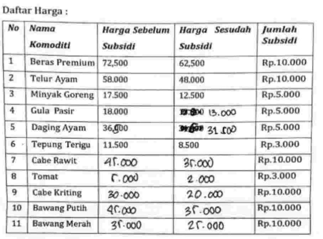 Berdasarkan data yang dihimpun Disdagperin, harga sejumlah bahan pokok di Airmadidi mengalami penurunan signifikan sejak diberlakukannya program subsidi. Berikut rincian harga sebelum dan sesudah subsidi. (DL)