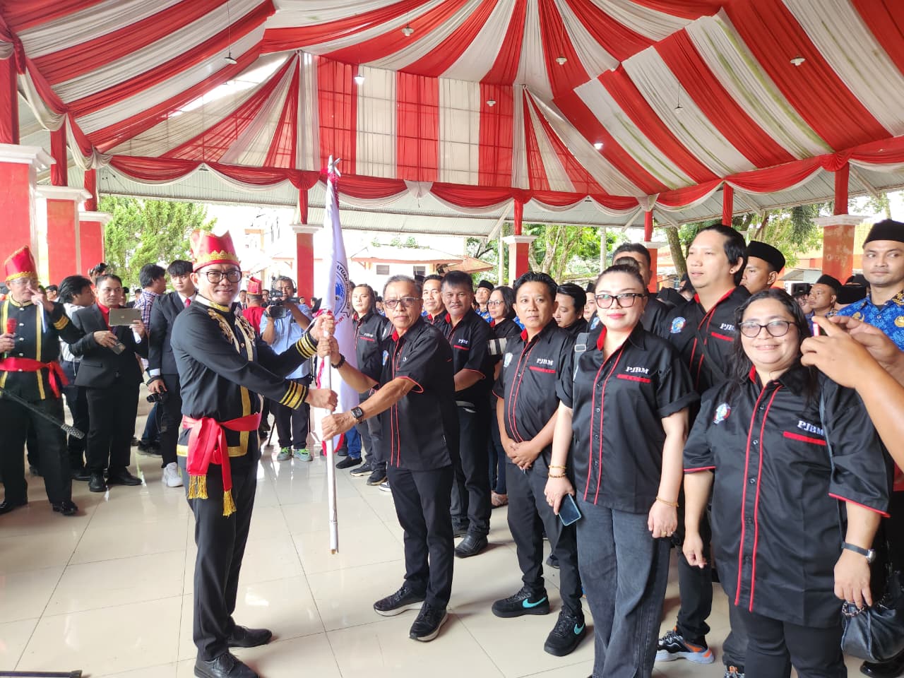 Gambar: Bupati Minahasa Utara Joune Ganda menyerahkan Pataka kepada Koordinator PJBM Fernandus Yusi Adam dalam prosesi pengukuhan PJBM di Kantor Bupati Minahasa Utara, Airmadidi, Kamis, 20 November 2025. (Foto: Denny/IKN).