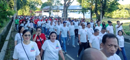 Bupati Minahasa Utara, Joune Ganda, yang memimpin langsung pelepasan peserta, menyampaikan pesan kuat di hadapan ribuan orang. “Jalan sehat ini bukan hanya tentang melangkahkan kaki, tetapi melangkahkan tekad dan semangat kita bersama,” tegasnya.
