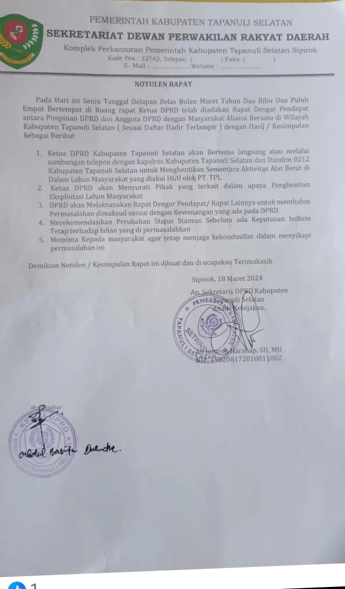 1. Ketua DPRD Tapsel akan bertemu langsung atau melalui sambungan telepon dengan Kapolres Tapsel dan Dandim 0212/TS Untuk menghentikan sementara Aktivitas Alat Berat di dalam lahan masyarakat yang diakui HGU oleh PT. TPL