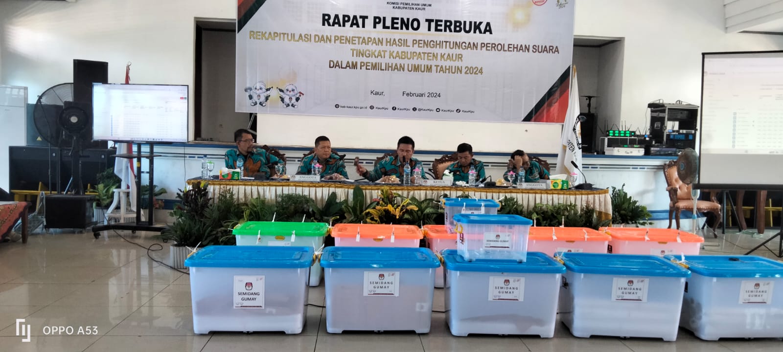 IKNews KAUR – Komisi Pemilihan Umum (KPU) Kabupaten Kaur menggelar rapat pleno terbuka rekapitulasi hasil penghitungan perolehan suara Pemilihan Umum (Pemilu) tahun 2024 tingkat Kabupaten, yang berlangsung di Aula Gedung Serba Guna Pemda Kaur Selasa (27/02/2024).