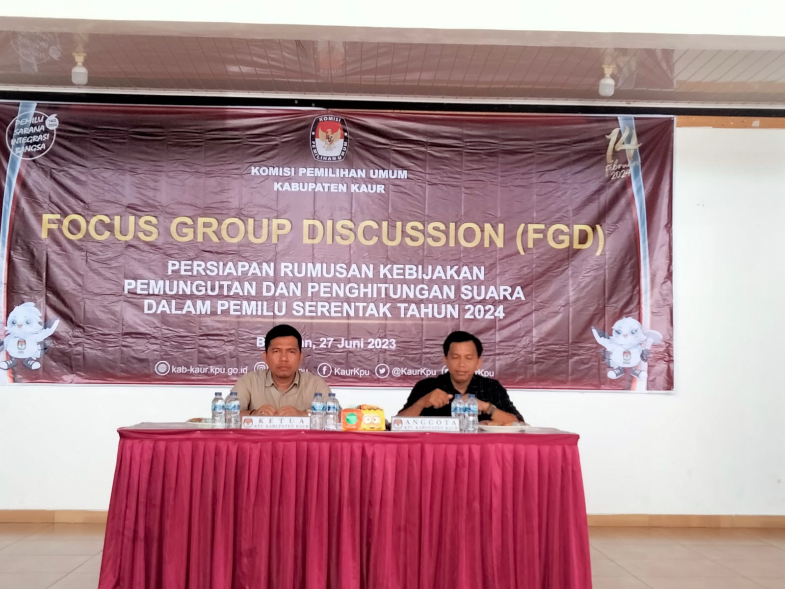 IKNews, KAUR – Komisi Pemilihan Umum Kabupaten Kaur Provinsi Bengkulu menggelar kegiatan Focus Group Discussion (FGD) Penyiapan Rumusan Kebijakan Pemungutan dan Penghitungan Suara Pada Pemilu Serentak Tahun 2024.