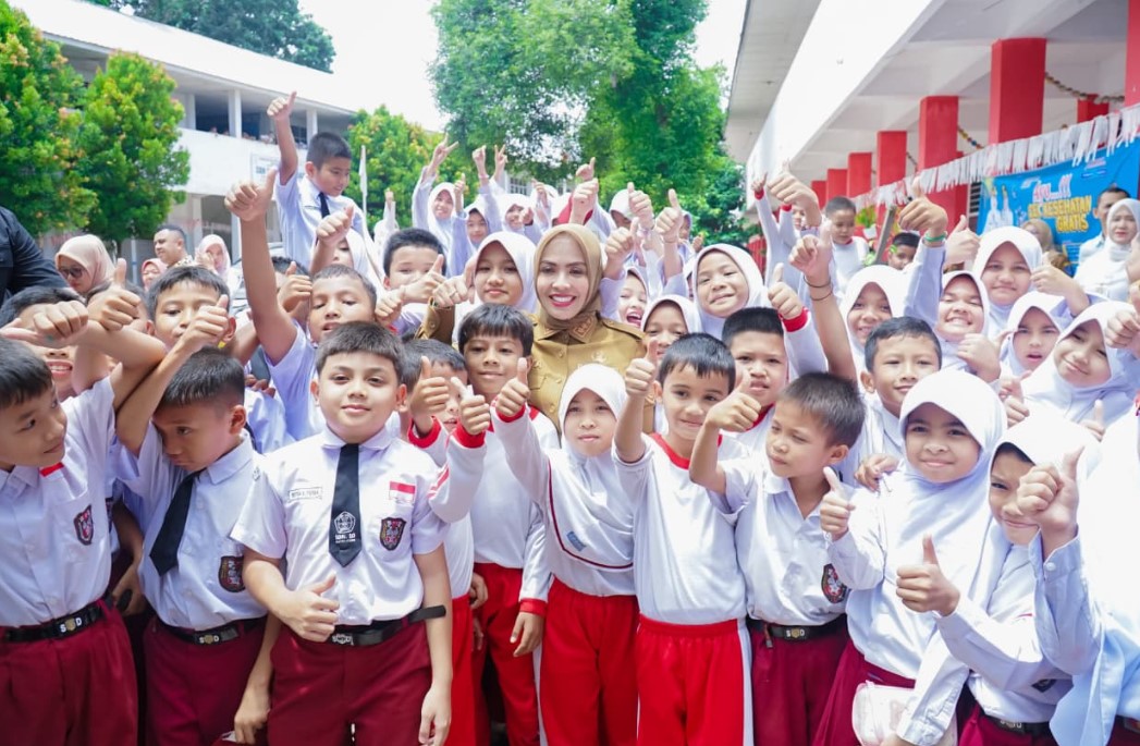 Gambar: Bupati Labuhanbatu dr. Hj. Maya Hasmita, Sp.OG., MKM., menyapa murid usai meninjau pelaksanaan pemeriksaan kesehatan di SDN 10 Rantau Utara, Senin, 15 September 2025. (Foto: Heri/IKN).
