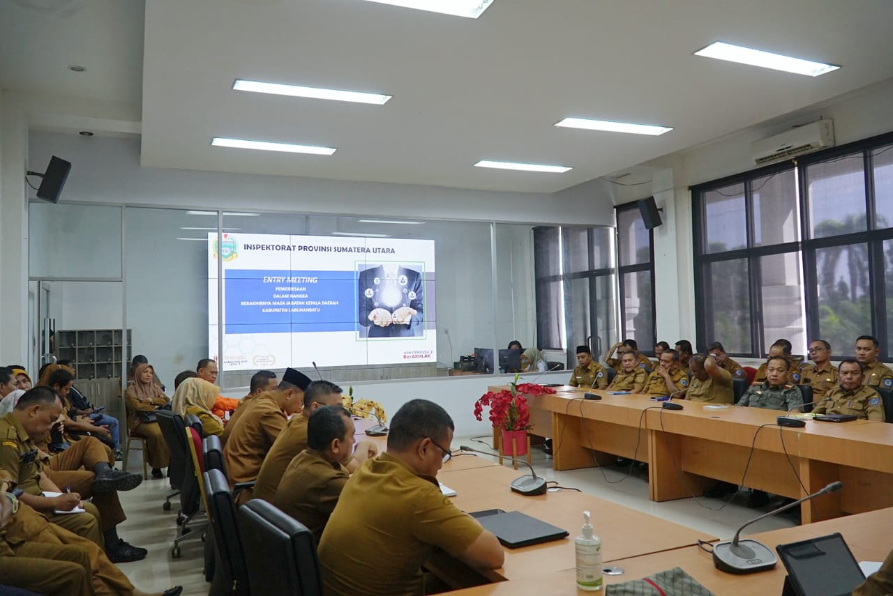 IKNews, LABUHANBATU – Pemerintah Provinsi Sumatera Utara melalui Tim Inspektorat menggelar Entry Meeting Pemeriksaan Akhir Masa Jabatan Kepala Daerah Periode 2021-2024 yang dilaksanakan di Ruang Rapat Kantor Bupati Labuhanbatu, Jalan Gose Gautama Ujung Bandar, Kecamatan Rantau Selatan, Senin (03/03). Kegiatan ini bertujuan untuk melakukan evaluasi terhadap kinerja pemerintah daerah dalam periode yang akan berakhir, dengan fokus pada berbagai aspek yang mempengaruhi kesejahteraan masyarakat dan daya saing daerah.