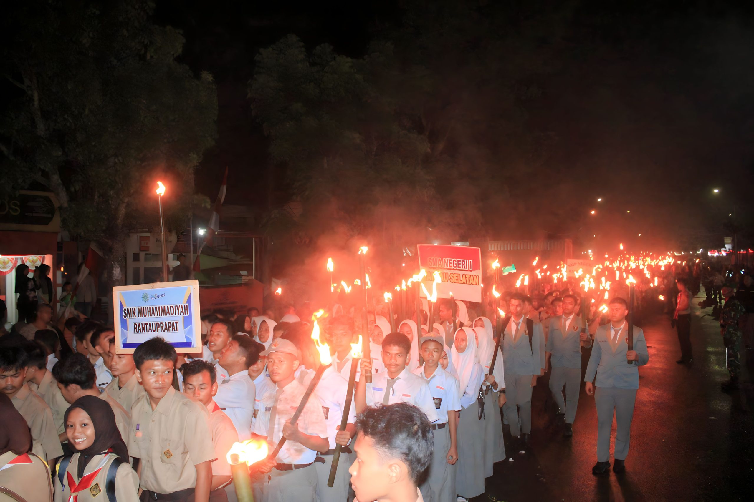 Pelaksanaan upacara Penetapan Waktu (Taptu) dan Pawai Obor berlangsung di Jalan WR Supratman, Kecamatan Rantau Utara, Jumat (16/08/2024) malam, yang dipimpin langsung Dandim 0209/LB Letkol INF Yudy Ardiyan Saputro.