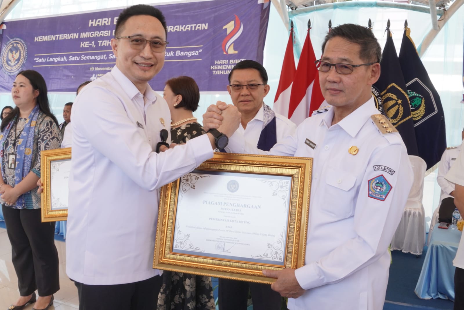 Piagam penghargaan tersebut diserahkan langsung oleh Kepala Kantor Wilayah Direktorat Jenderal Imigrasi Sulawesi Utara, Ramdhani, sebagai bentuk apresiasi atas peran aktif Pemkot Bitung dalam mendukung kebijakan penanganan warga keturunan Filipina yang telah bermukim di wilayah pesisir Sulawesi Utara, khususnya di Kota Bitung.