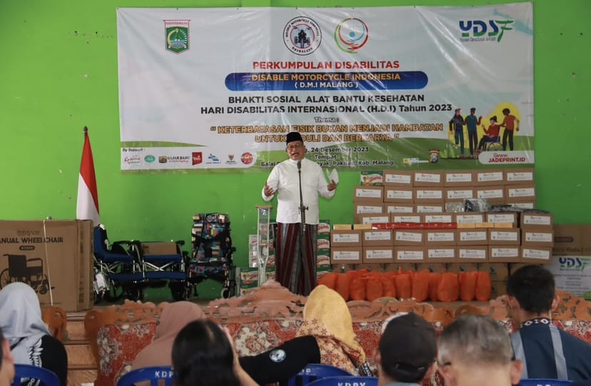 IKNews, MALANG – Wakil Bupati Malang Drs. H. Didik Gatot Subroto, S.H, M.H menghadiri Bhakti Sosial Alat Bantu Kesehatan yang diselenggarakan oleh Disable Motorcycle Indonesia (DMI) dalam rangka memperingati Hari Disabilitas Internasional Tahun 2023 berlokasikan di Balai Desa Kendalpayak Kecamatan Pakisaji, Minggu (24/12/2023).