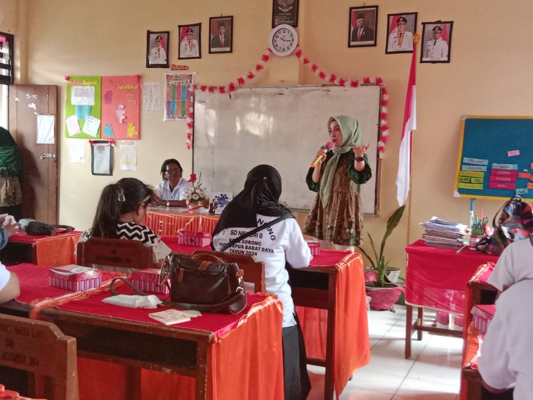 Kepala Sekolah SDN 8 Kota Sorong, Ibu Dominggas Iek, S.Pd., menyampaikan tujuan kedatangan mereka, yaitu untuk belajar dan mengadopsi kegiatan serupa di sekolah mereka.