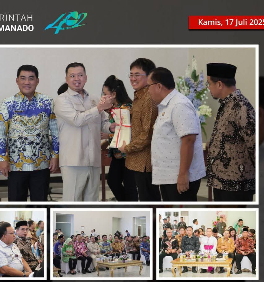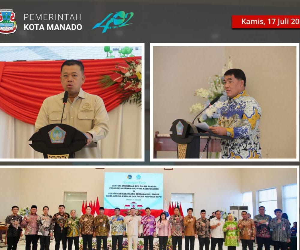 IKNews, MANADO – Wali Kota Manado, Bpk. Andrei Angouw, menghadiri kegiatan Kunjungan Kerja Menteri Agraria dan Tata Ruang/Kepala Badan Pertanahan Nasional (ATR/BPN) dalam rangka Penandatanganan Nota Kesepahaman (MoU) dan Perjanjian Kerja Sama bersama MUI, Sinode GMIM, Gereja Katolik, dan Pucuk Pimpinan KGPM, yang dilaksanakan di Wisma Negara Bumi Beringin Manado kamis(17/07/25)