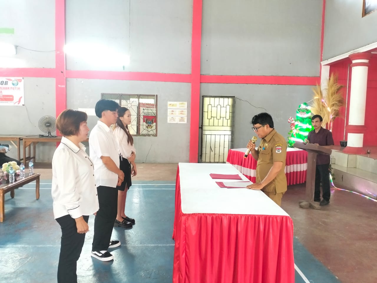 Gambar: Pj. Hukum Tua Desa Lelema, Robert R. Karinda, S.Sos., MM, melantik tiga perangkat desa baru, yakni Kepala Seksi Pelayanan Siske Slat, Kepala Seksi Tata Usaha Rani Langi, dan Kepala Jaga 2 Queen Bate, di BPU Desa Lelema, Kecamatan Tumpaan, Selasa, 23 Desember 2025. Foto: Andrey/IKN.