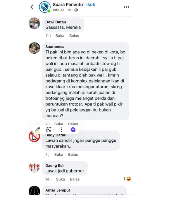 Gambar: Komentar salah satu nitizen di media sosial yang menyebut wali kota adhan dambea hanya biki rebut daerah, 14 oktober 2025. Foto : tangkapan layar akun "sauracsa" di media social facebook.