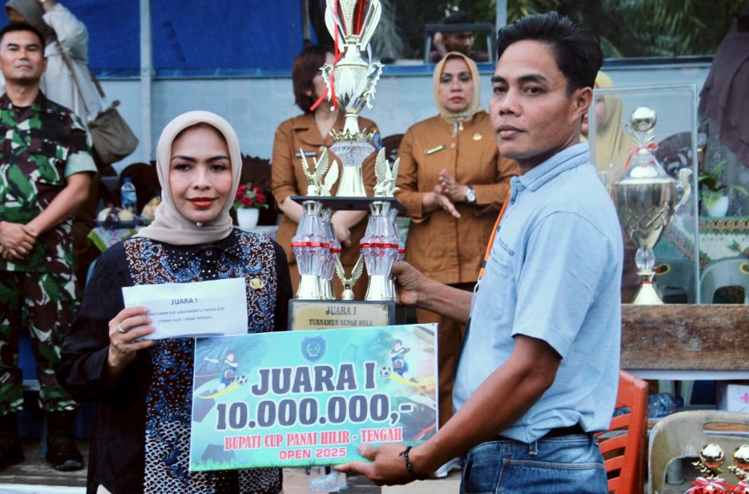 IKNews, TOUNA — Sorak sorai riuh menggemakan Lapangan Sepak Bola Desa Sei Sanggul, Kecamatan Panai Hilir, saat Bupati Labuhanbatu, dr. Hj. Maya Hasmita, Sp.OG., MKM., menutup secara resmi Turnamen Sepak Bola Bupati Cup Panai Hilir – Panai Tengah Tahun 2025, pada Senin (20/10) sore.