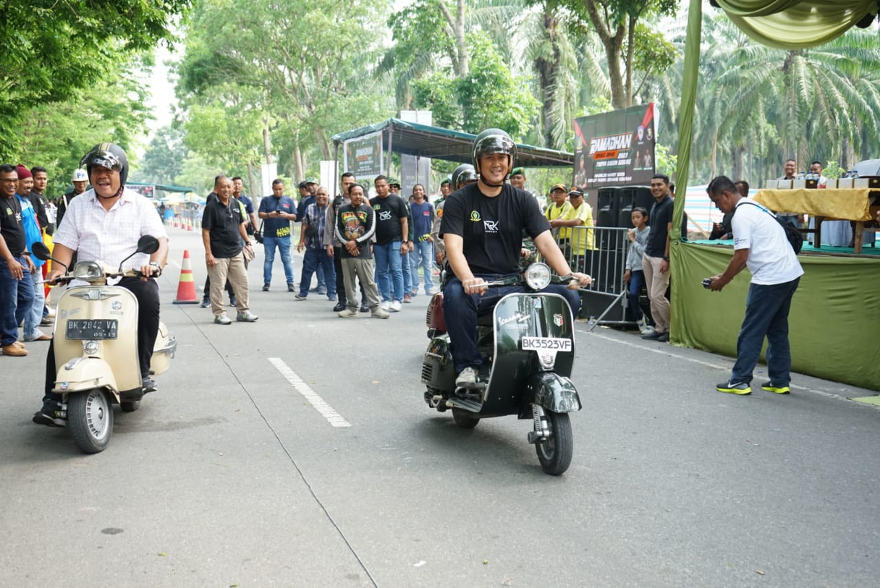 Sebelum acara Even Ramadhan Drag Bike Trophy Dandim 0208/AS dibuka, terlebih dahulu dilakukan Test Drive menggunakan Sepeda Motor Vespa oleh Dandim 0208 Asahan, Kapolres Asahan dan Wakil Bupati Asahan di Lapangan Pabrik Benang, Minggu (19/3/2023).