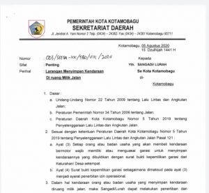 Kotamobagu – Pemerintah Kota (Pemkot) Kotamobagu mengeluarkan surat edaran nomor 003/SETDA-KK/580/VIII/2020, tentang larangan menyimpan kendaraan di ruang milik jalan. Surat edaran yang
