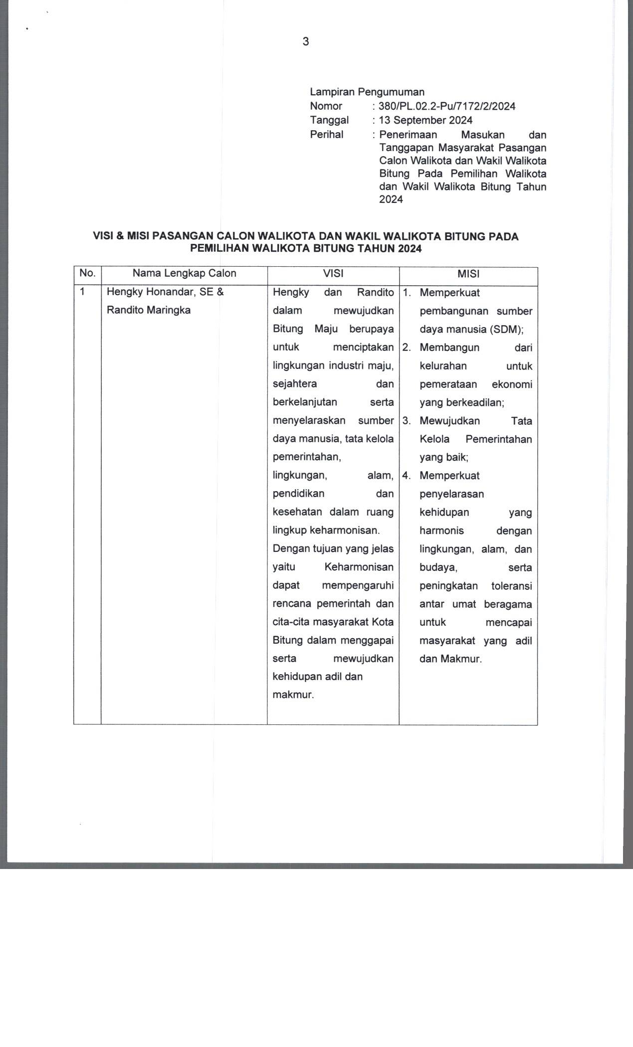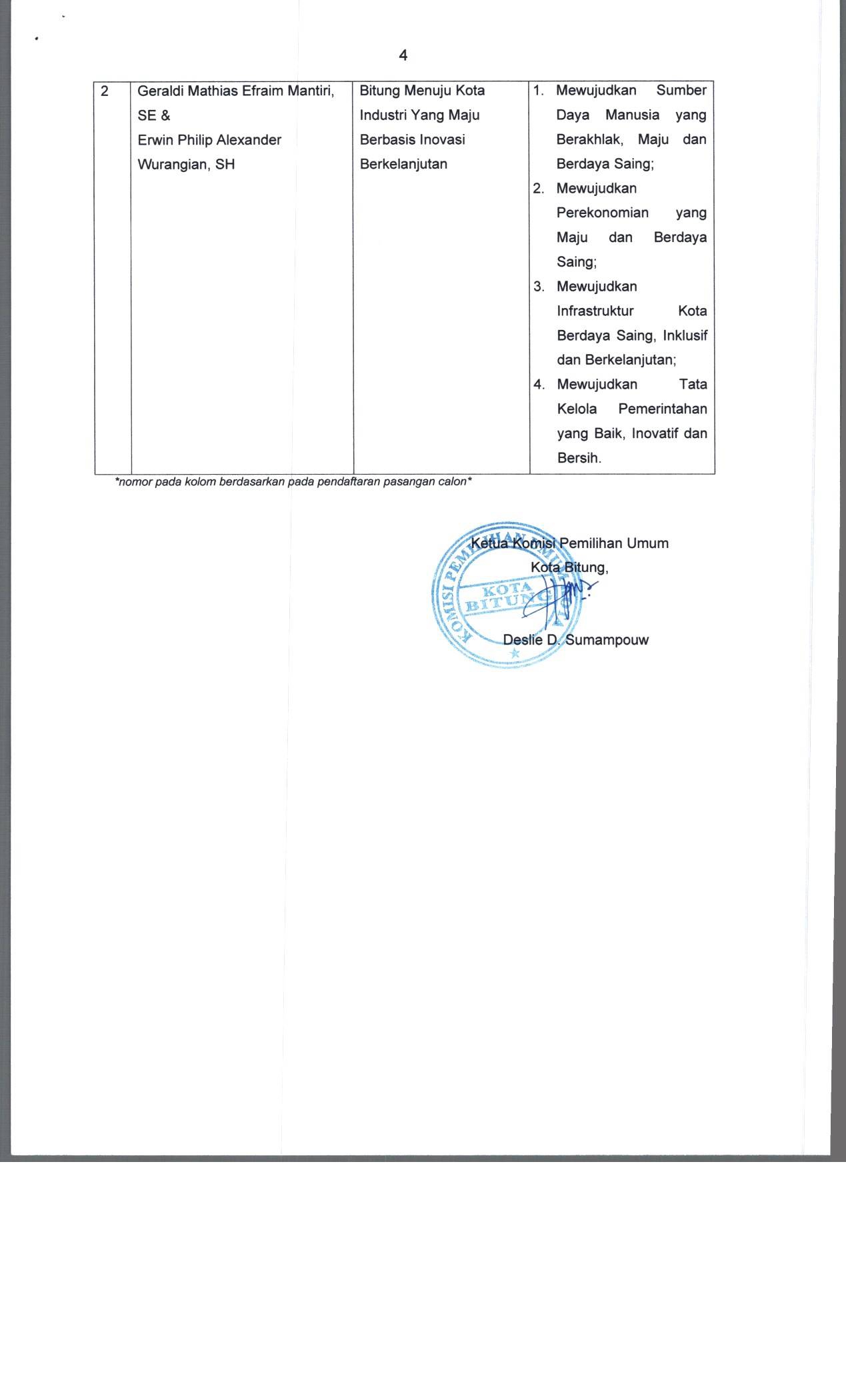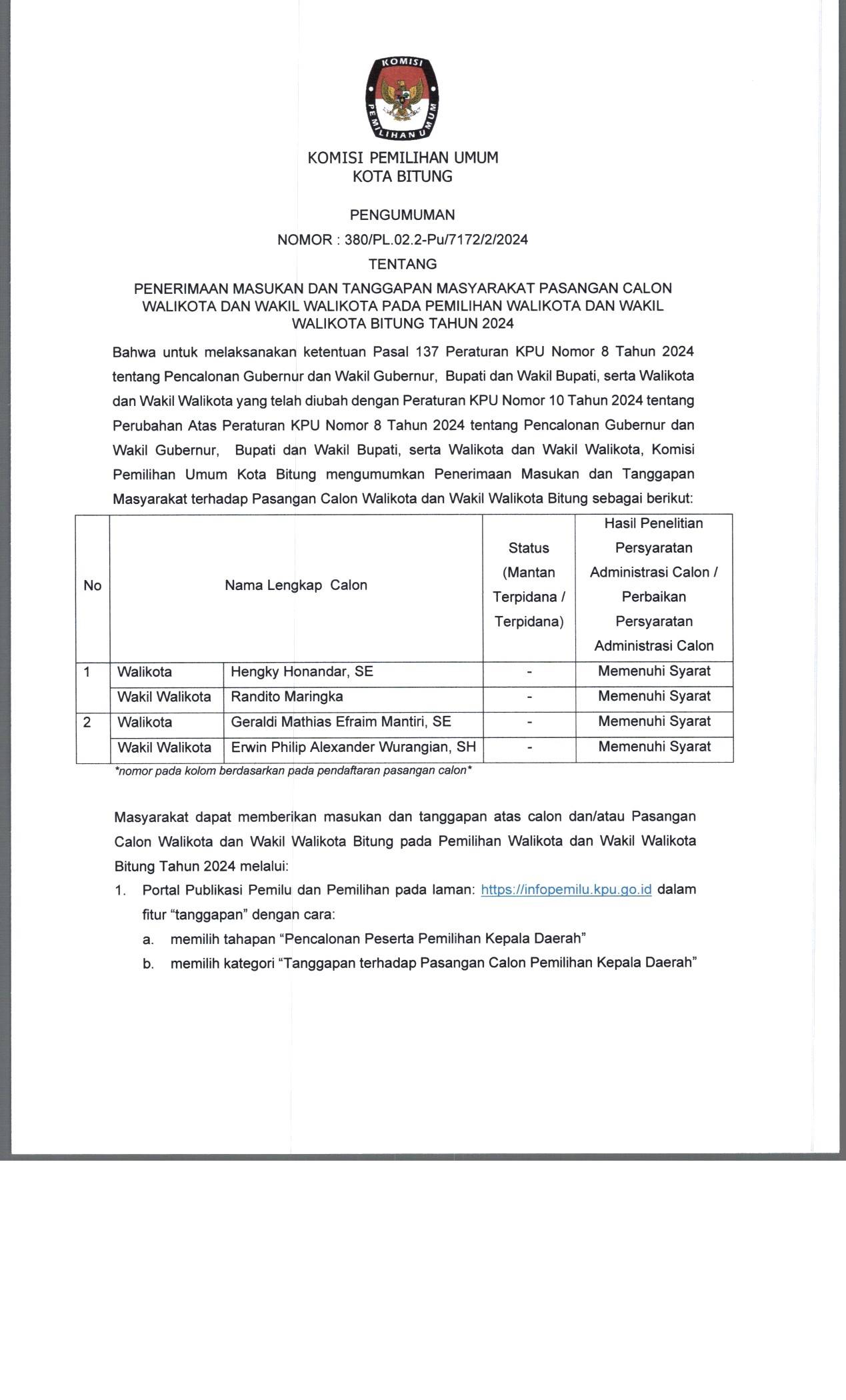 Pencalonan Gubernur dan Wakil Gubernur, Bupati dan Wakil Bupati, serta Walikota dan Wakil Walikota, Komisi Pemilihan Umum Kota Bitung mengumumkan Penerimaan Masukan dan Tanggapan Masyarakat terhadap Pasangan Calon Walikota dan Wakil Walikota Bitung meliputi :