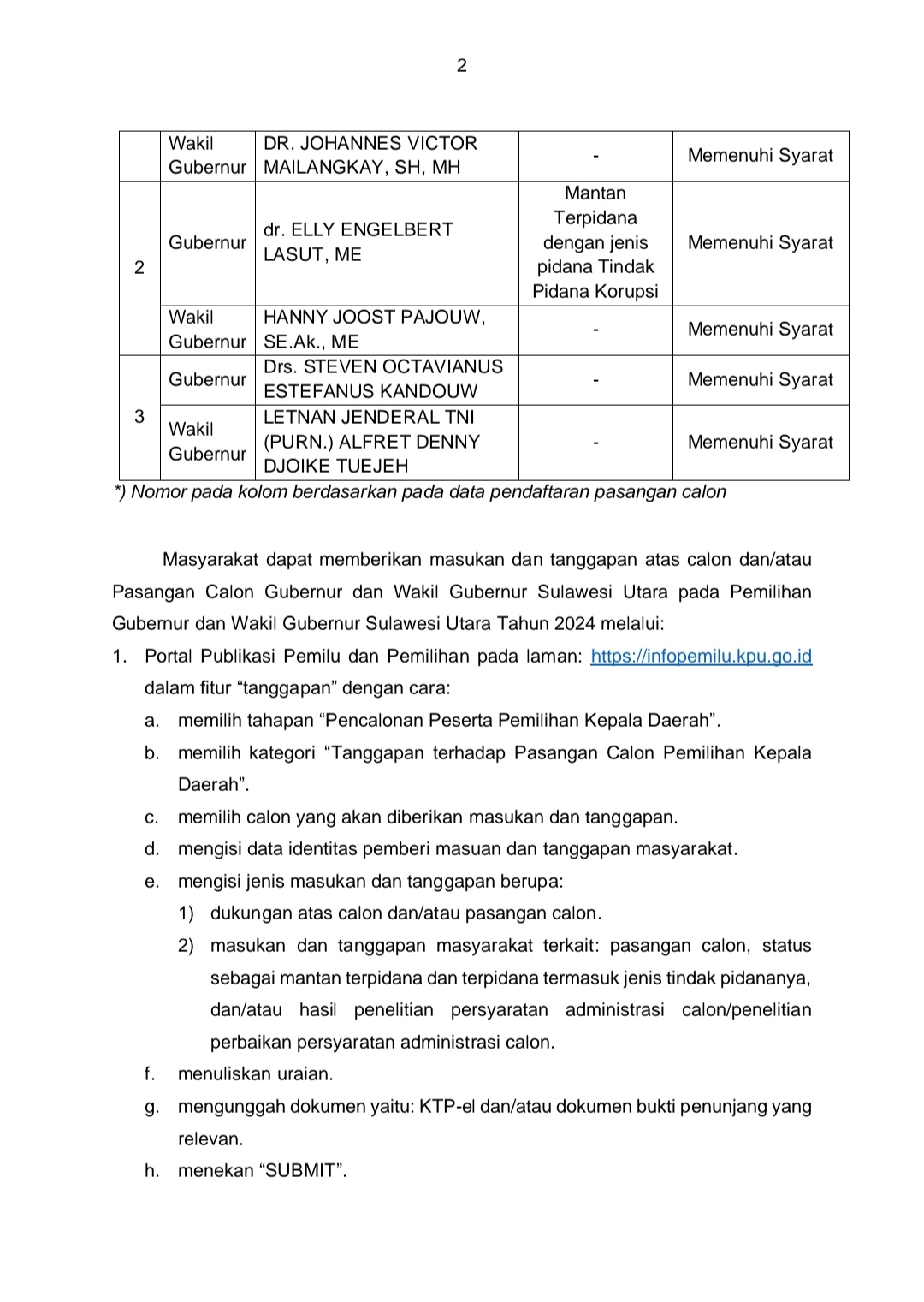 IKNews-SULUT– Berdasarkan Surat Nomor: 607/PL.02.2-Pu/71/2.1/2024 Komisi Pemilihan Umum (KPU) Provinsi Sulawesi Utara (Sulut) Umumkan Penerimaan Masukan dan Tanggapan Masyarakat Pasangan Calon Gubernur dan Wakil Gubernur Sulawesi Utara Pemilihan Tahun 2024.