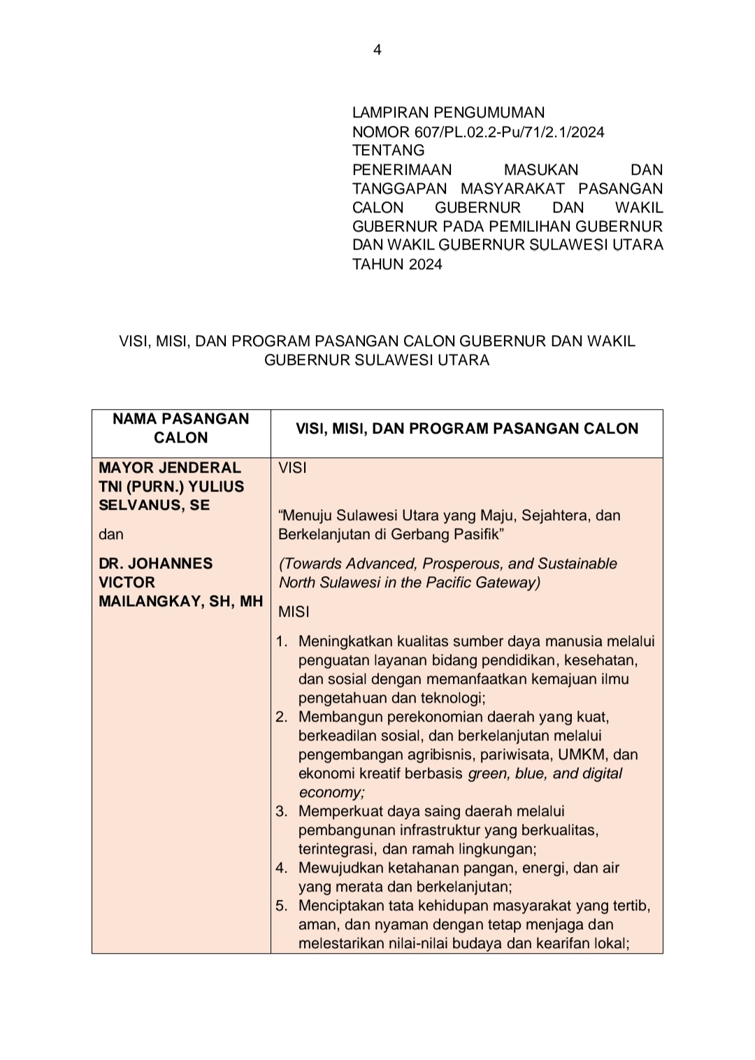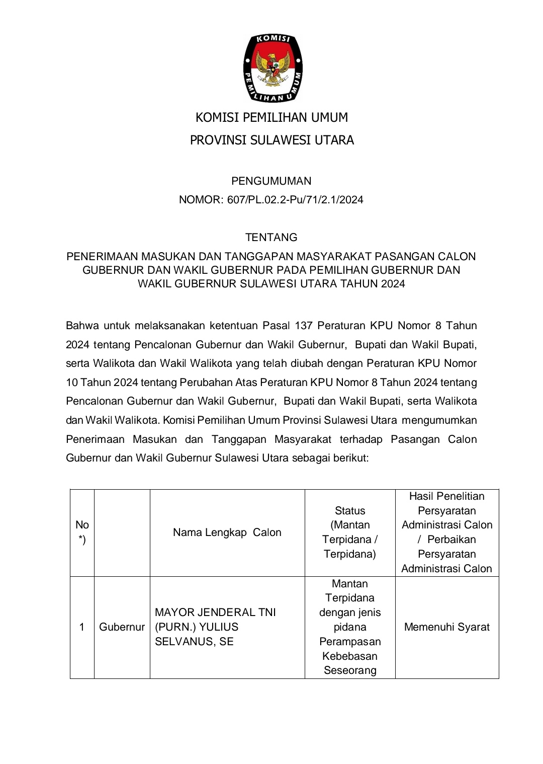 IKNews-SULUT– Berdasarkan Surat Nomor: 607/PL.02.2-Pu/71/2.1/2024 Komisi Pemilihan Umum (KPU) Provinsi Sulawesi Utara (Sulut) Umumkan Penerimaan Masukan dan Tanggapan Masyarakat Pasangan Calon Gubernur dan Wakil Gubernur Sulawesi Utara Pemilihan Tahun 2024.