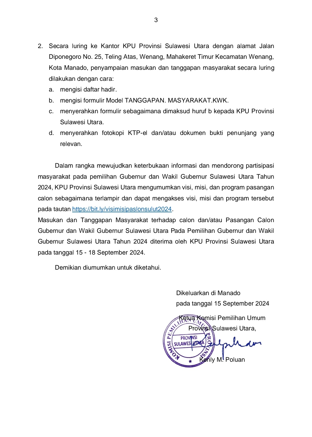 KPU Sulut Umumkan Penerimaan Masukan dan Tanggapan Masyarakat Terhadap Paslon Gubernur dan Wakil Gubernur Sulawesi Utara Dalam Pilkada 2024