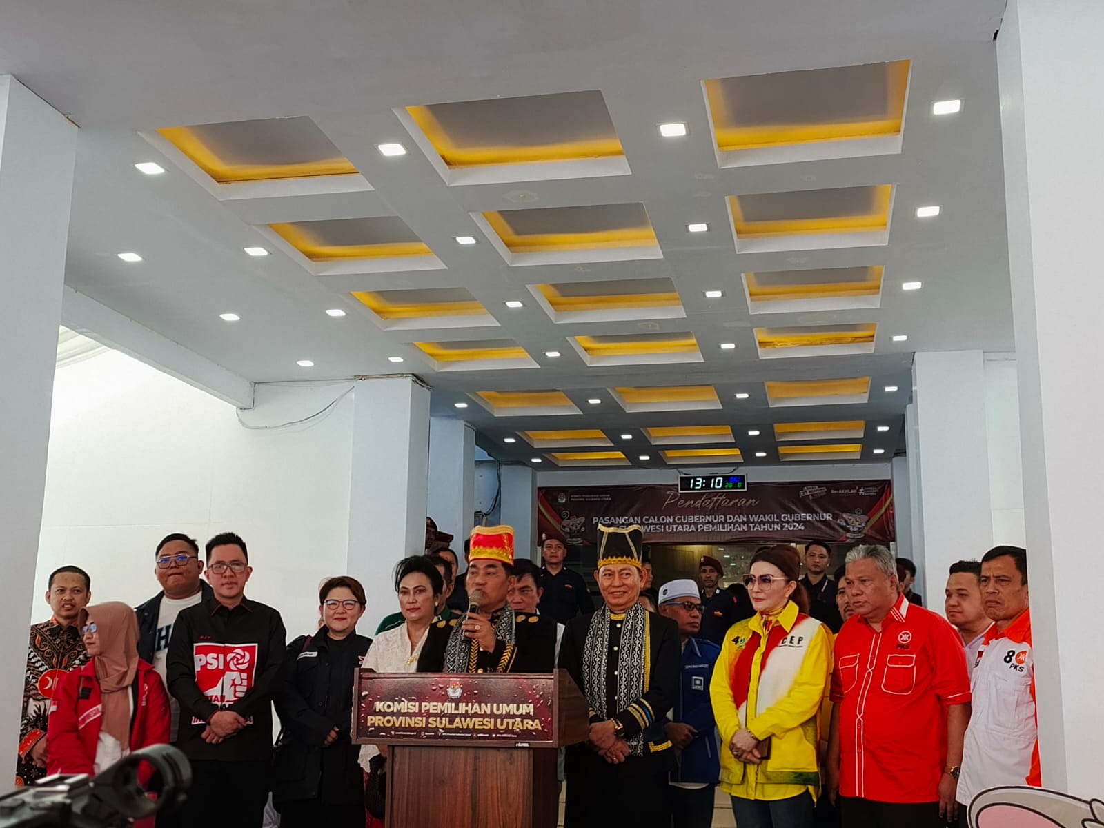 “Kami Bakal Calon Gubernur dan Wakil Gubernur Sulut Yulius Selvanus dan Victor Mailangkay datang bersama Partai-partai koalisi kami dari Partai Gerindra, Nasdem, Golkar, PSI, PKS, PAN, PKB, Perindo bahkan masih ada 8 lagi Partai koalisi kami, jadi total ada 16 partai yang mendukung kami sebagai Bakal Calon Gubernur dan Wakil Gubernur Sulut. Kerena banyaknya partai pendukung sehingga pelaksanaan pendaftaran kami berlangsung selama 3 jam,” ujarnya