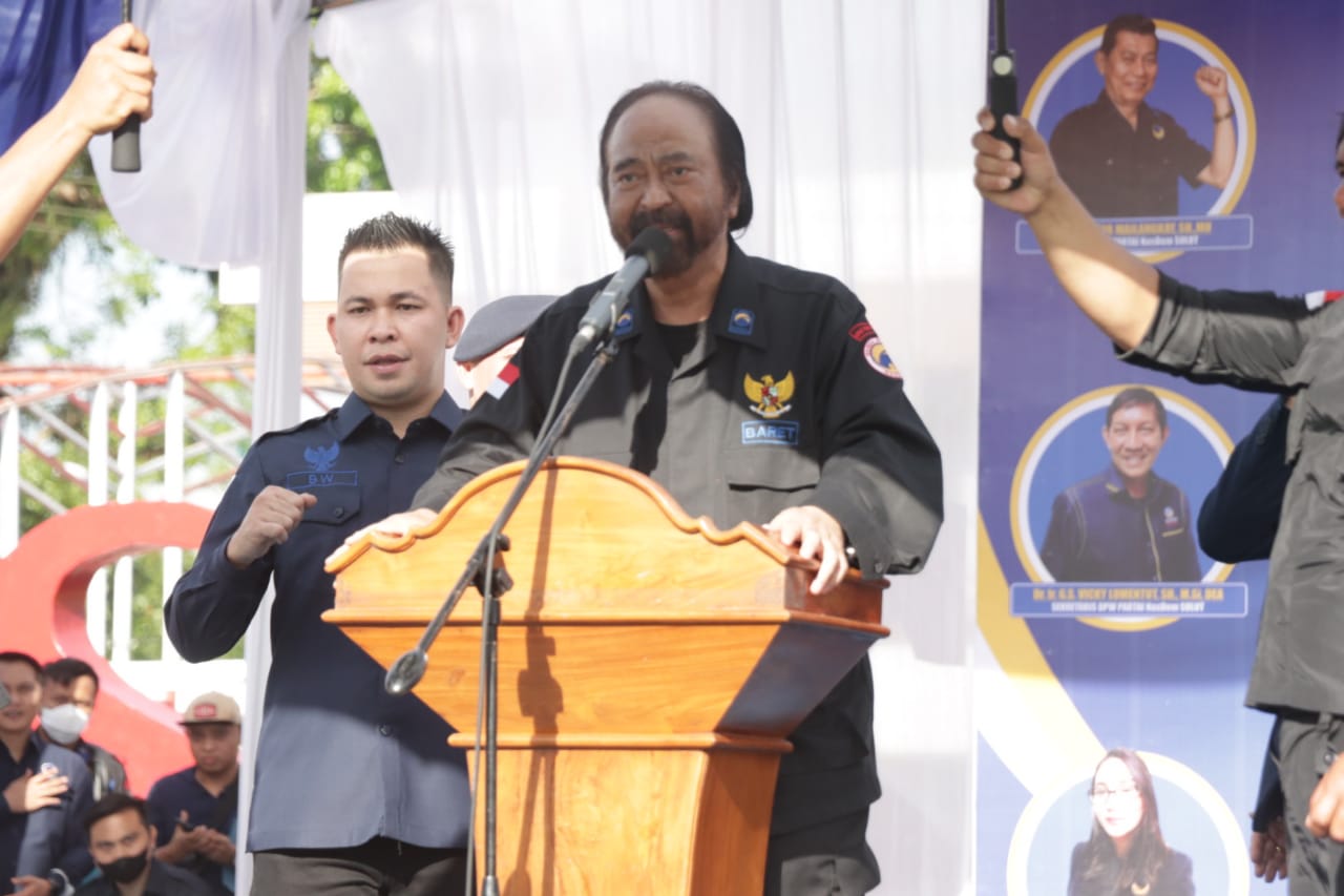 “Wajar partai kita mau besar, wajar jadi pemenang dan bahkan wajar Braien Waworuntu jadi bupati. Itu adalah hak kita. Inilah tempat kita untuk laksanakan aktivitas idealisme,” kata Surya Paloh disambut tepukan tangan oleh kader Nasdem dan masyarakat sekitar yang hadir.