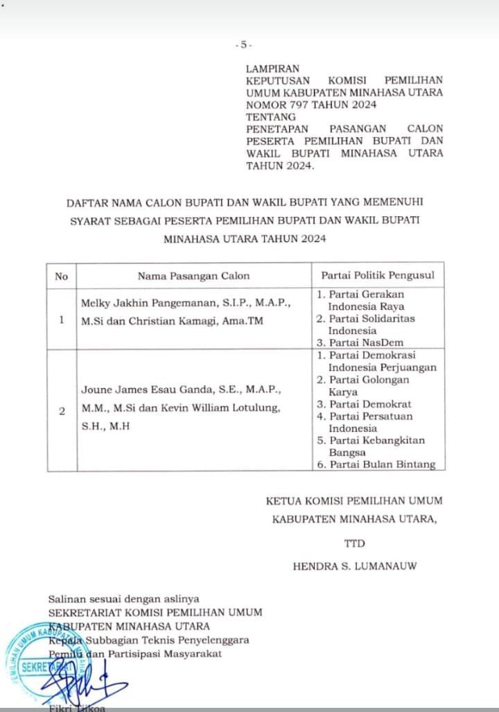 IKNews, MINUT – Joune J.E. Ganda dan Kevin William Lotulung (JGKWL) secara resmi ditetapkan oleh Komisi Pemilihan Umum (KPU) Minahasa Utara sebagai calon Bupati dan Wakil Bupati dalam Pilkada 2024. Penetapan yang berlangsung pada Minggu (22/9/2024) diikuti dengan doa bersama oleh para tokoh lintas agama se-Kabupaten Minahasa Utara di JG Center.