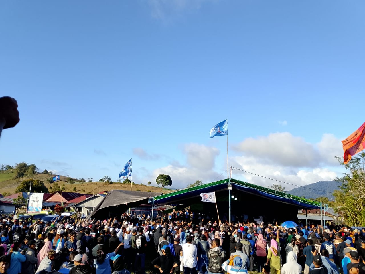 Suasana riuh dengan teriakan massa, “Oras menang torang kawal sampai jadi,” pun menggema di sekitar areal lapangan ketika pasangan tiba di lokasi.