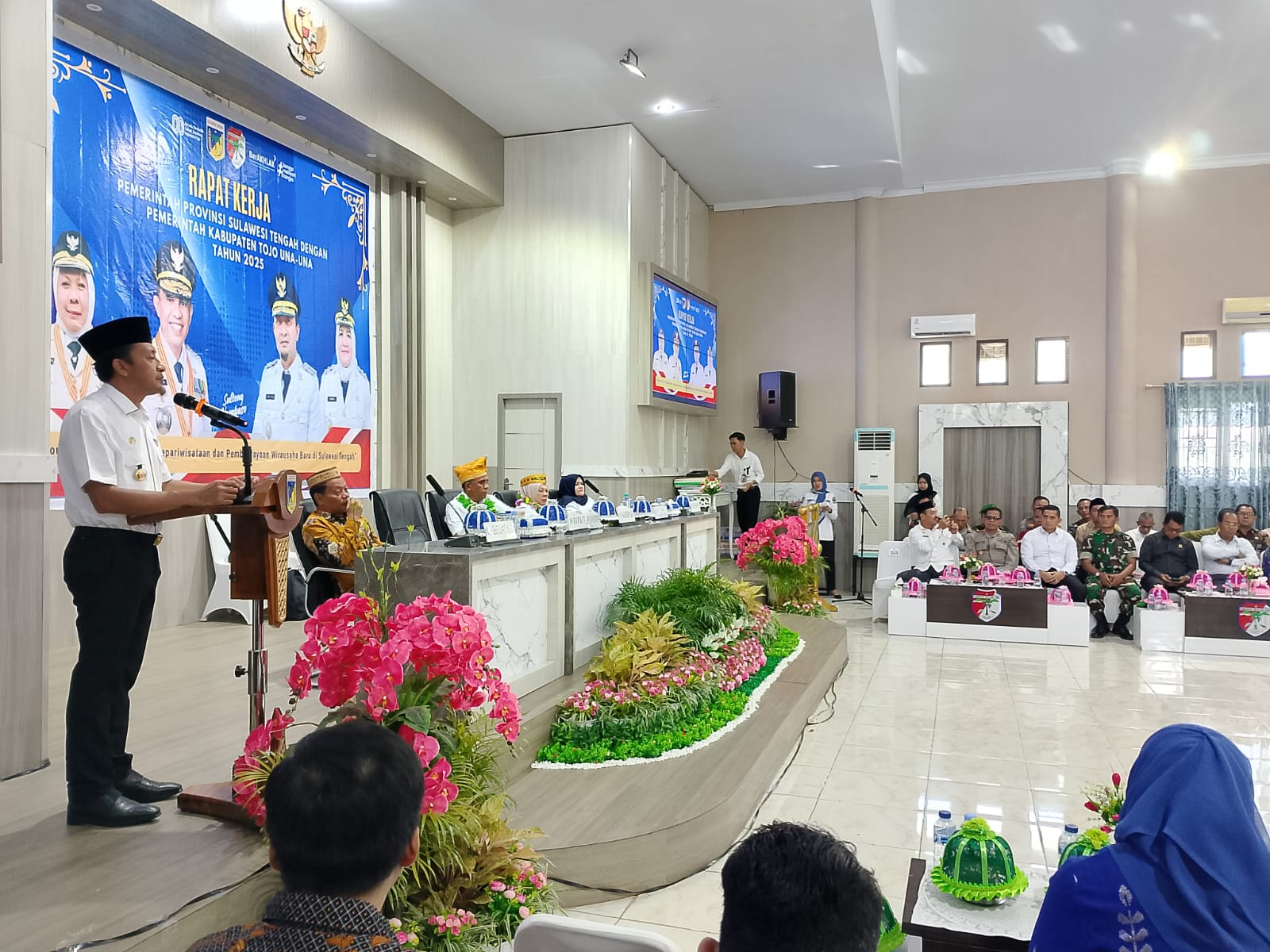 Gambar: Bupati Tojo Una-Una Ilham Lawidu berbicara dalam rapat kerja bersama jajaran Pemprov Sulteng di Auditorium Kantor Bupati Touna, Jumat, 14 November 2025. Foto: Budi Dako.