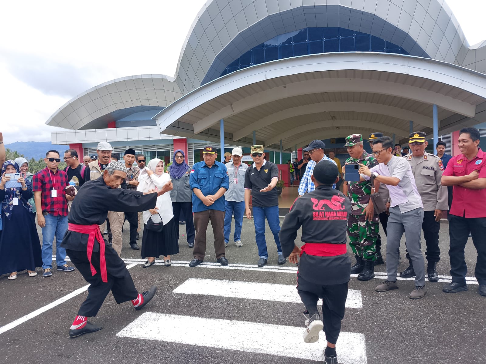 Bupati dan Wakil Bupati, bersama Forkopimda, menyambut kedatangan pesawat dengan pengalungan bunga oleh putra-putri Dinas Pariwisata Tojo Una-Una.