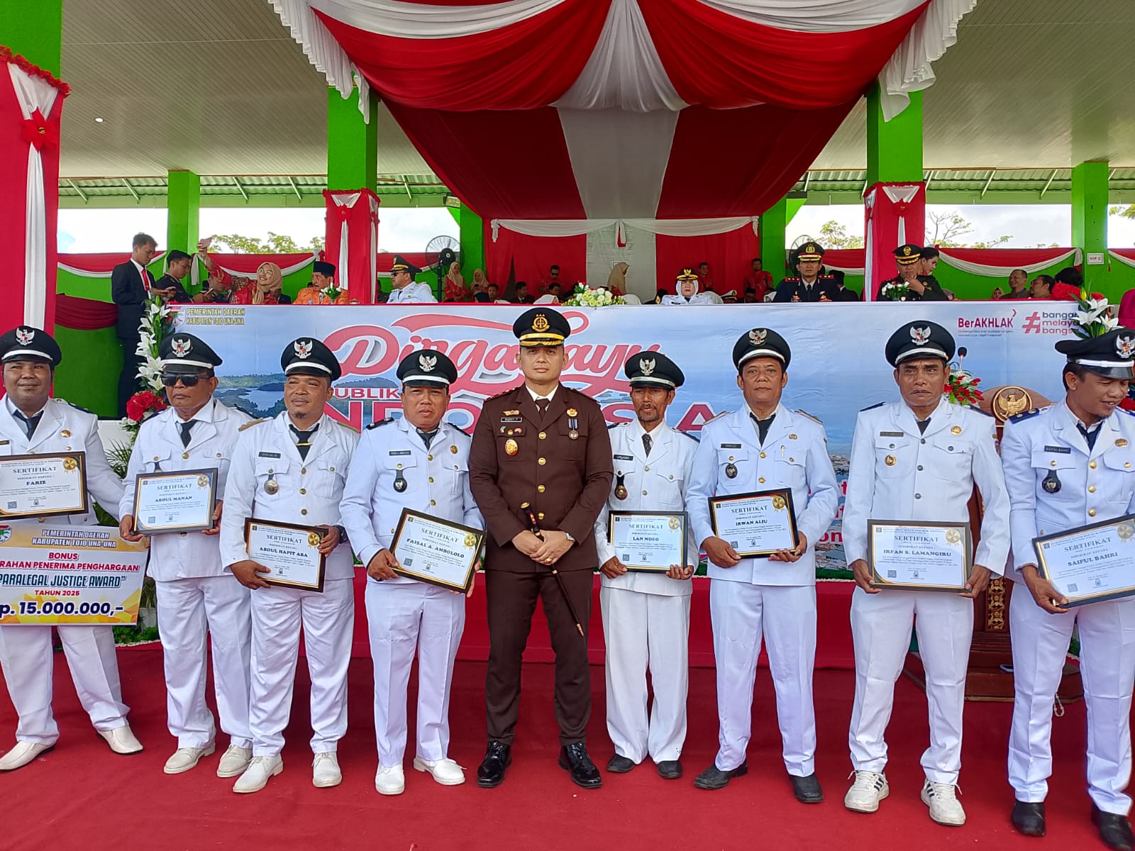 Kajari Tojo Una-Una, Dr. Rizky Fachrurrozi, S.H., M.H., menyerahkan Sertifikat dan Bonus Paralegal Justice Award kepada Lurah Labiabae Fariz Latjuba serta sejumlah kepala desa, di antaranya Abdul Hafit Aba, Abdul Manan, Faisal A. Ambololo, Lan Ndeo, Irwan Aliu, Irfan S. Lamangiru, dan Saiful Bhari (Kades Urundaka).