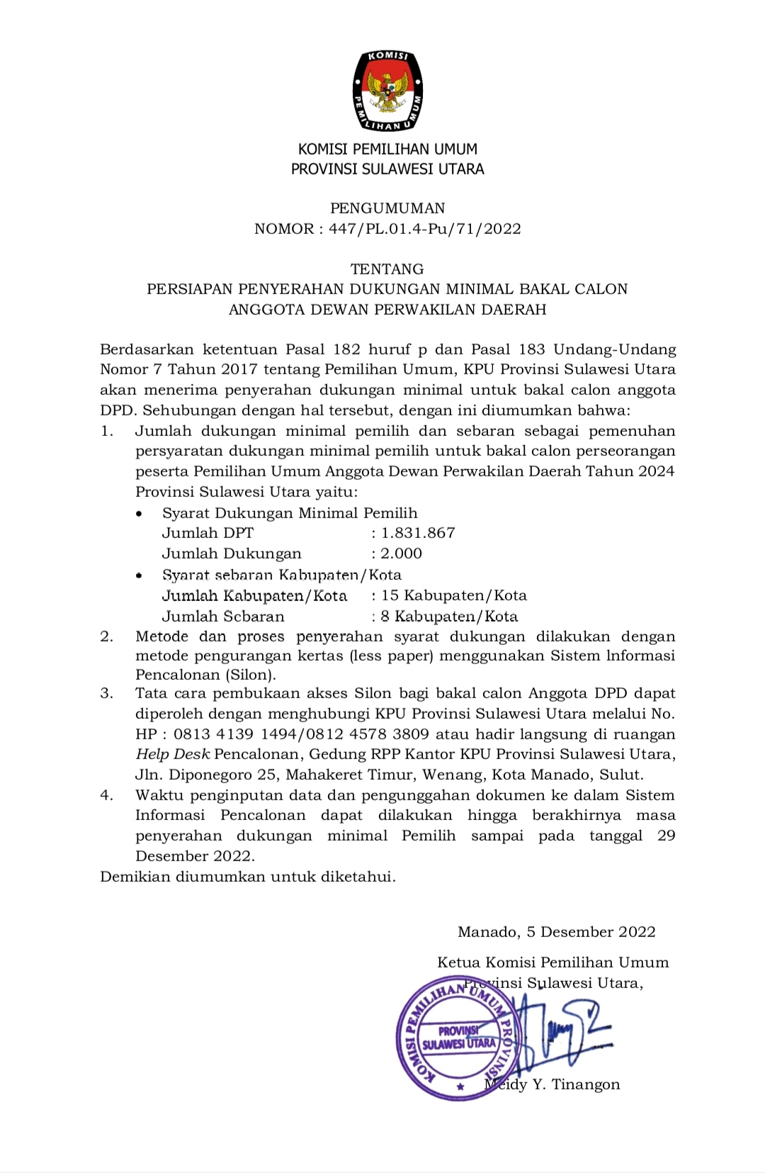 INFOKINI.NEWS-SULUT-Berdasarkan Surat No: 447/PL. 01.4-Pu/71/2022. Komisi Pemilihan Umum Provinsi Sulawesi Utara mengumumkan tentang persiapan penyerahan dukungan minimal bakal calon Anggota Dewan Perwakilan Daerah (DPD).