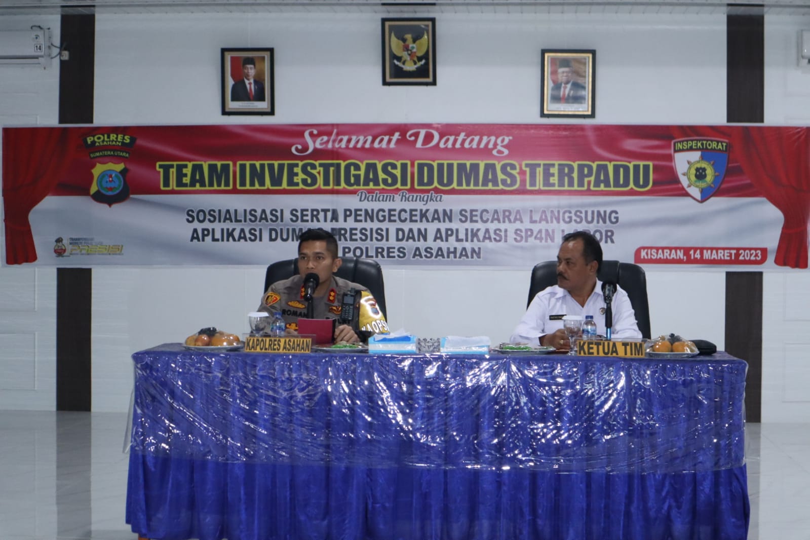 IKnews, ASAHAN – Kapolres Asahan, AKBP Roman Smaradhana Elhaj menyambut kedatangan Tim investigasi Dumas Presisi Polda Sumatera Utara (Sumut) dalam rangka sosialisasi serta pengecekan secara langsung aplikasi Dumas Presisi dan aplikasi SP4N Lapor di Polres Asahan.