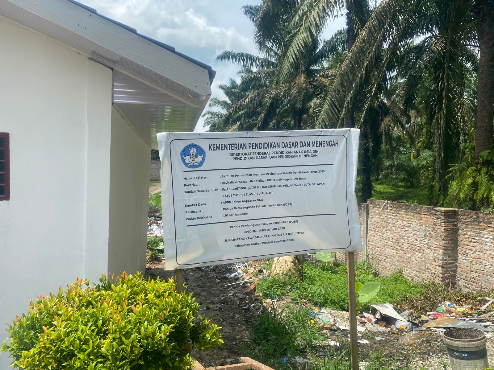 IKNews, ASAHAN – Proyek revitalisasi di UPTD SMP Negeri 1 Air Batu, Kabupaten Asahan, yang didanai oleh APBN melalui Kementerian Pendidikan Dasar dan Menengah Tahun 2025, tengah berjalan namun menyisakan sejumlah kejanggalan. Pengerjaan yang diperkirakan hampir selesai ini menelan anggaran sekitar Rp. 1.094.917.000 dan dikerjakan secara swakelola oleh P2SP (Panitia Pembangunan Satuan Pendidikan). Namun, menurut hasil pantauan di lapangan, proyek tersebut tampak jauh dari harapan.