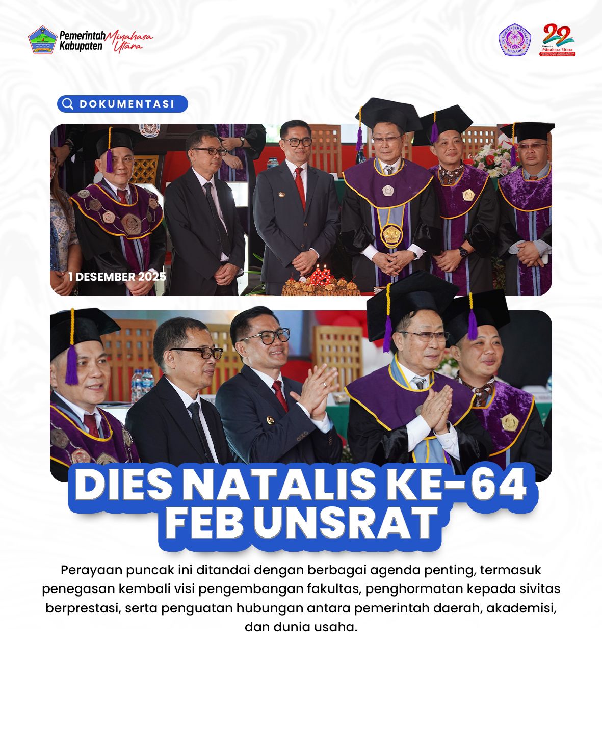 Acara puncak ditandai dengan penegasan visi pengembangan fakultas, penghormatan kepada sivitas berprestasi, serta penguatan sinergi antara pemerintah daerah, dunia usaha, dan akademisi. Kegiatan ini diharapkan menjadi titik awal peningkatan kualitas pendidikan tinggi dan kontribusi nyata bagi kemajuan Minahasa Utara dan Sulawesi Utara. (Mg02)