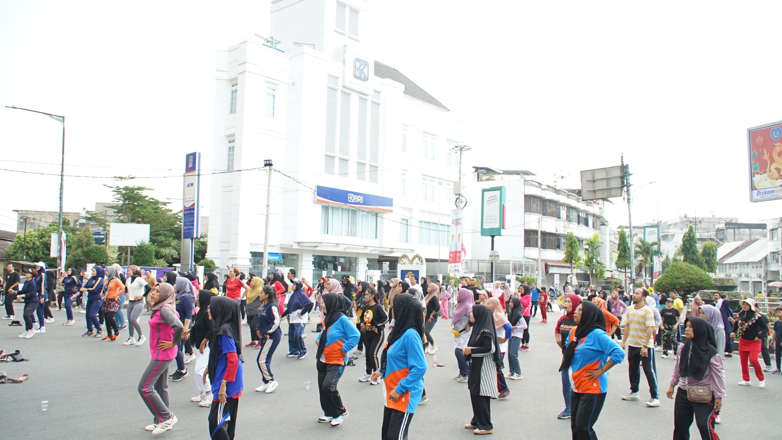 Tampak peserta senam begitu semangat dan antusias mengikuti gerakan yang dipandu instruktur. Senam diikuti berbagai kalangan, dewasa maupun anak-anak.