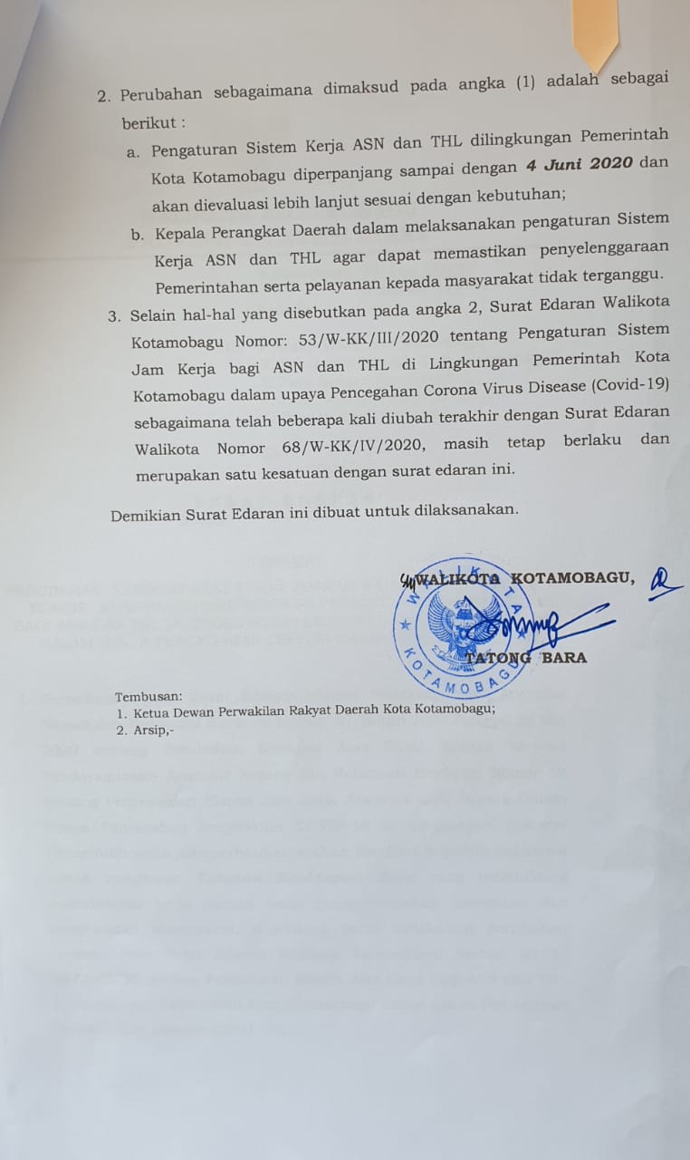 “Pengaturan sistem kerja ASN dan THL dilingkungan Pemerintah Kota Kotamobagu diperpanjang sampai dengan 4 Juni 2020 dan akan dievaluasi lebih lanjut sesuai dengan kebutuhan,” bunyi isi surat edaran.