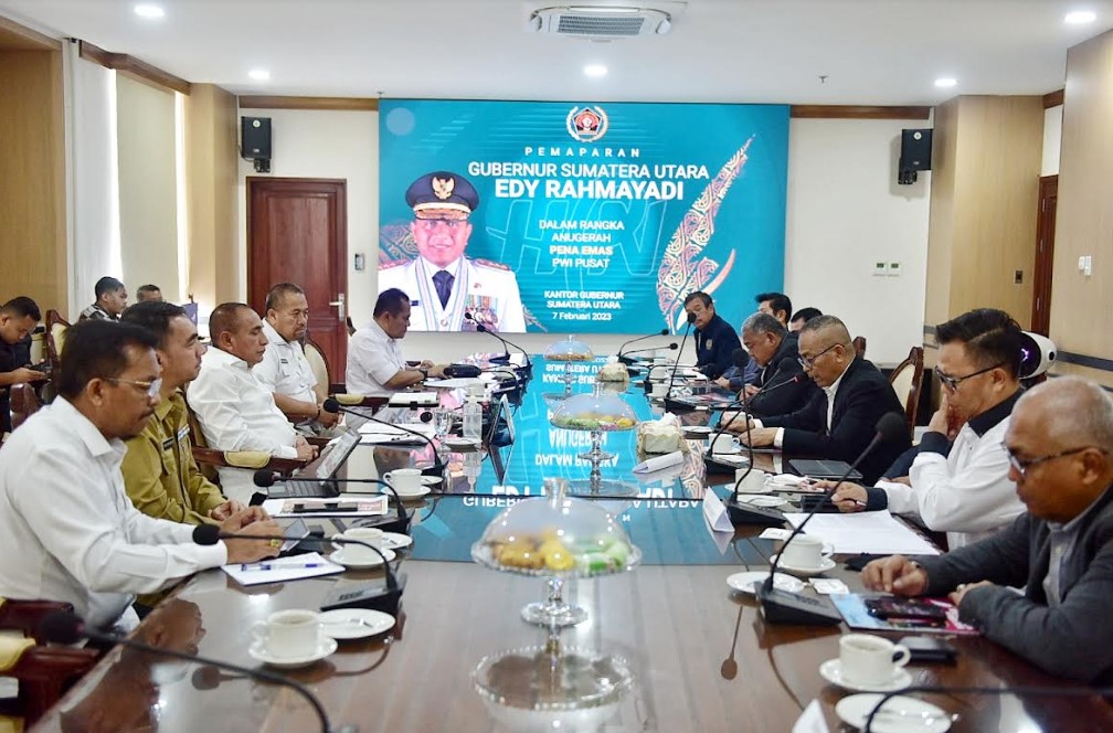 Gubernur Sumatera Utara (Sumut) Edy Rahmayadi memaparkan makalah Pers Mitra Strategis, Wujudkan Sumut Yang Maju, Aman dan Bermartabat di hadapan panelis Persatuan Wartawan Indonesia (PWI) Pusat dalam rangka Anugerah Pena Mas di Ruang Rapat Lantai 10, Kantor Gubernur Sumut, Jalan Pangeran Diponegoro Medan, Selasa (7/2/2023). (Foto Dinas Komunikasi dan Informatika Provinsi Sumut : Veri Ardian)