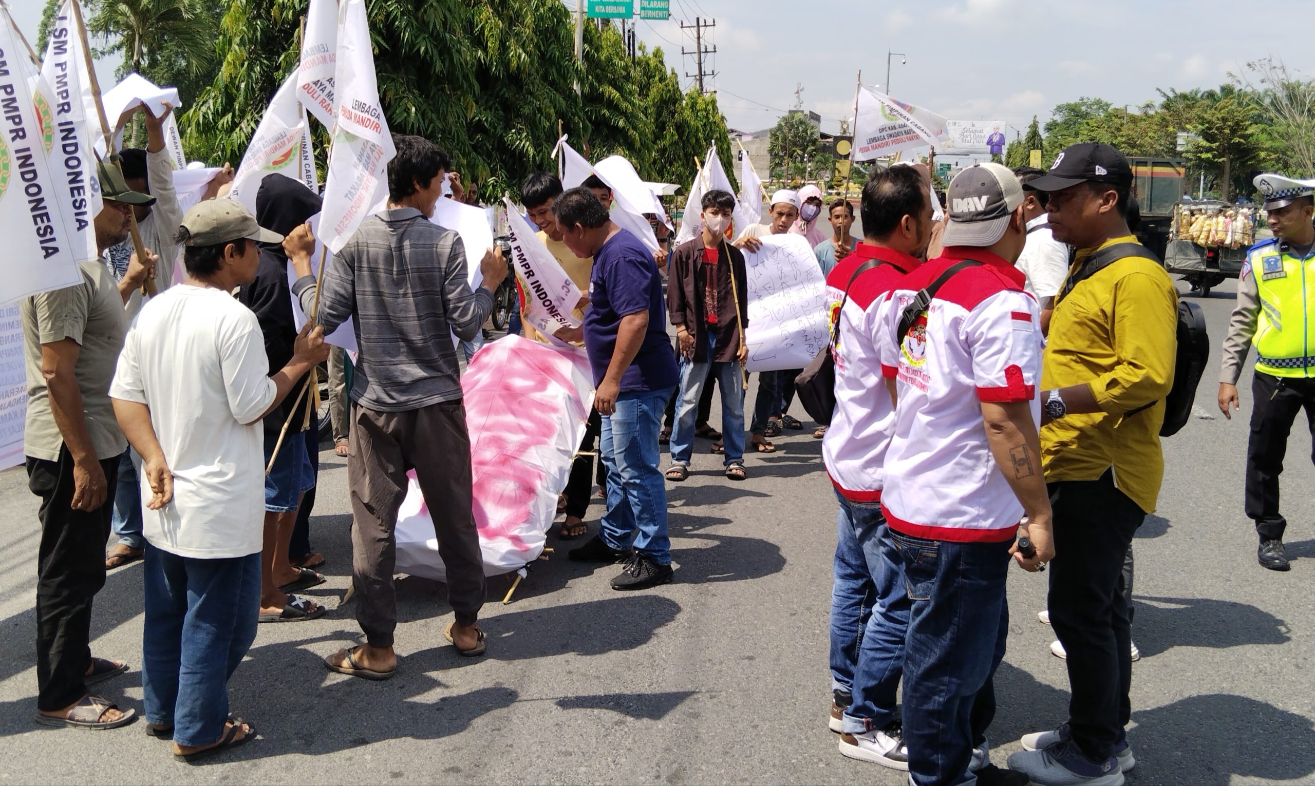 Massa yang datang dengan menggunakan beberapa becak,sepedamotor membawa soundsistem, miniatur keranda mayat,spanduk dan foster yang bertuliskan hujatan kepada Bupati Asahan.