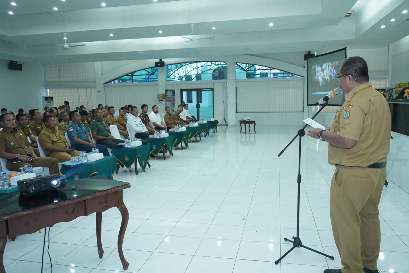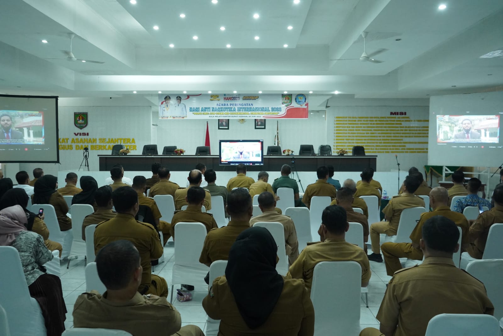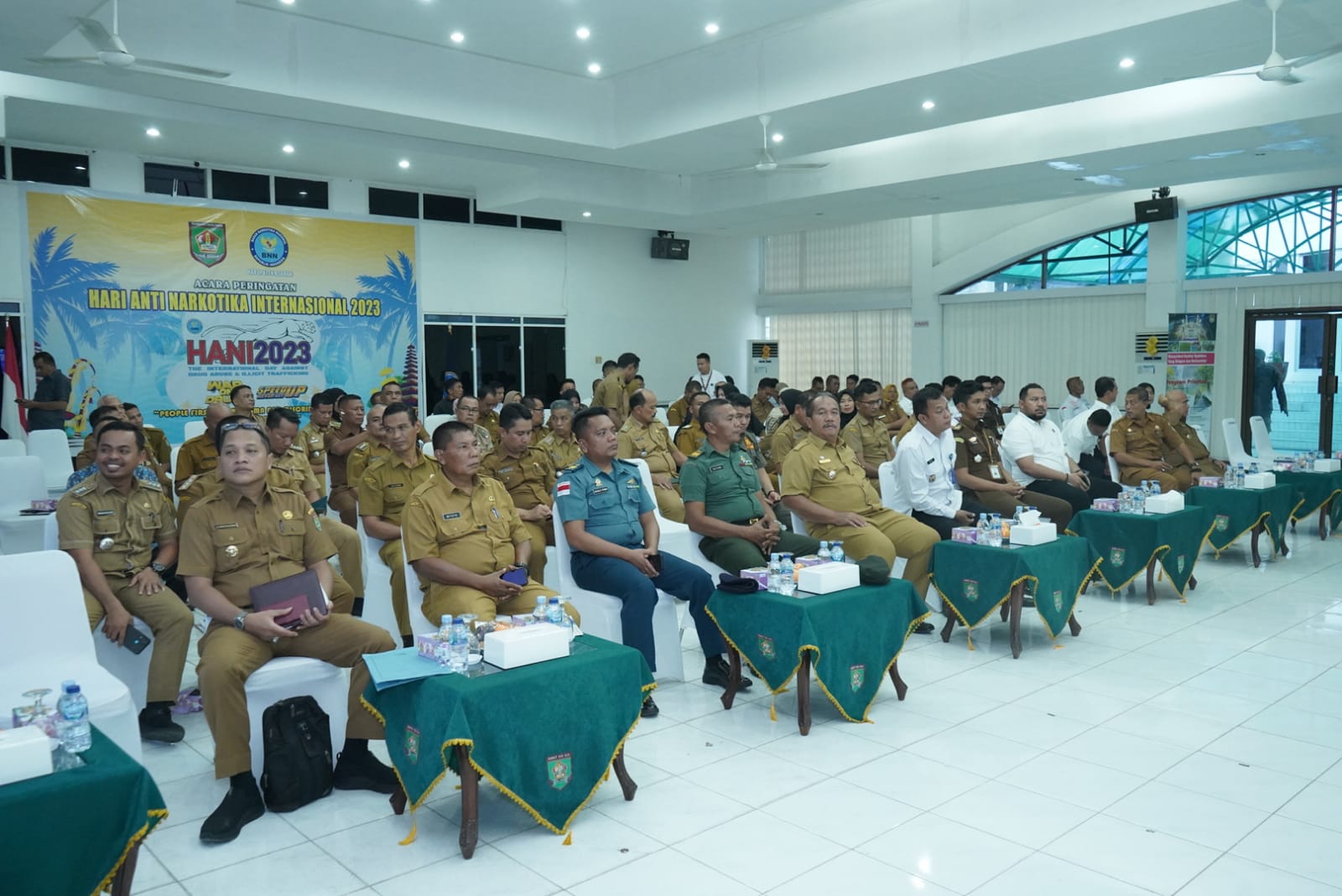 Wakil Bupati bersama Forum Koordinasi Pimpinan Daerah (Forkopimda) Kabupaten Asahan dan Badan Narkotika Nasional Kabupaten Asahan mengikuti kegiatan tersebut secara virtual di Aula Mawar Kantor Bupati Asahan, Senin (26/6/2023).