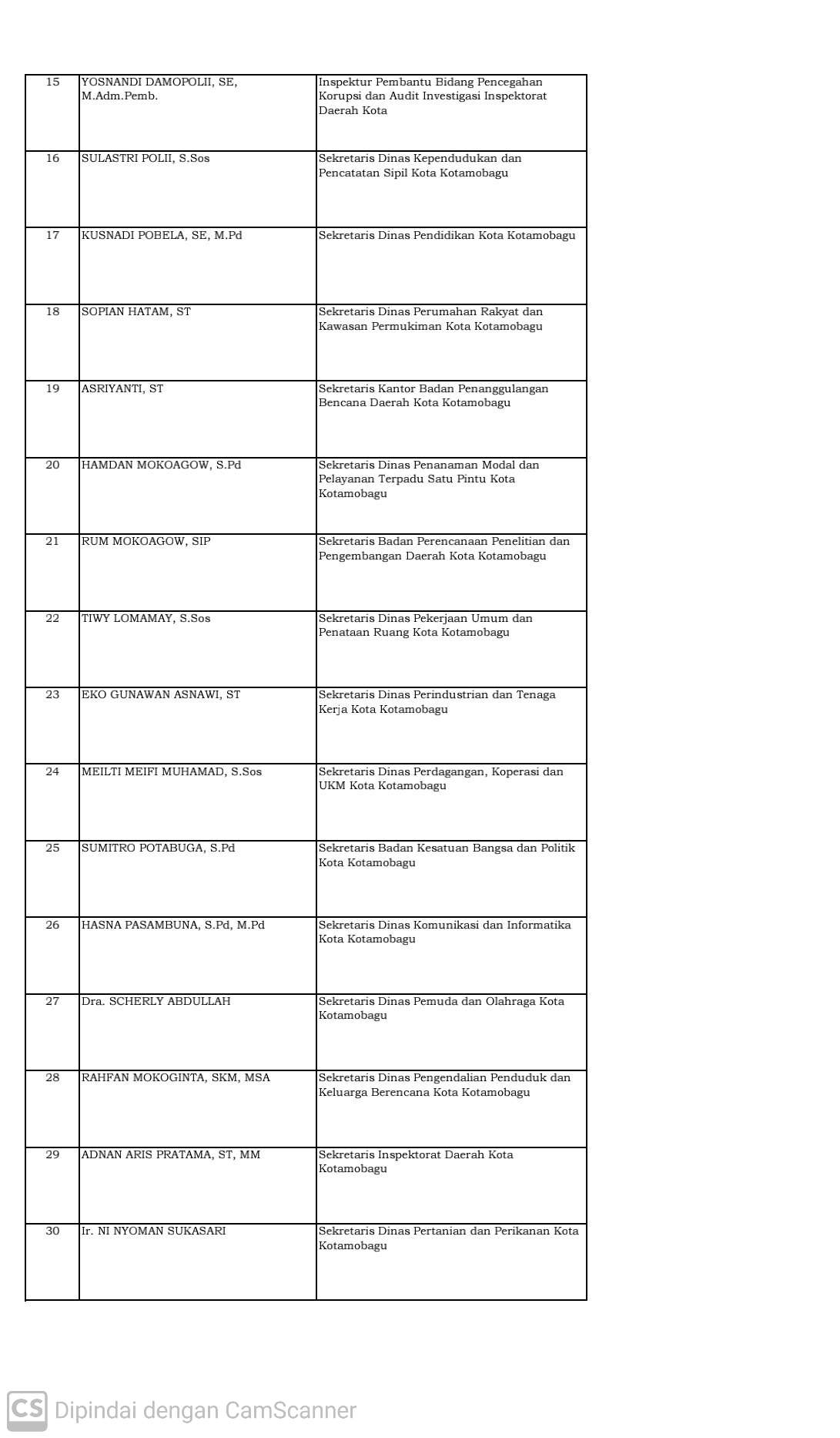 Inilah Daftar Lengkap Pejabat Eselon 2 dan 3 Baru Dilantik Walikota Kotamobagu 10 Desember 2021oleh deden syaidin-537 Dilihatoleh deden syaidin Kotamobagu – Inilah daftar lengkap Nama-Nama Pejabat Eselon 2 dan 3, yang baru dilantik Walikota Kotamobagu Tatong Bara, di aula Rumah Dinas Walikota Kotamobagu, Jumat 10 Desember 2021. Berikut daftarnya: Post Views: 537 Jangan LewatkanDugaan Korupsi di Bolmut: Publik Desak Kejagung Turun TanganNeon Box Rusak, Kadinkes Touna DisorotASTAGA! Oknum Guru Cabul di Kepahiang Lolos PPPKProyek Puskesmas Buntu Limbong Tersendat, Tukang Andalkan Air HujanKomisi III DPR RI Buka Fakta Gelap Kasus Dana Syariah Indonesia