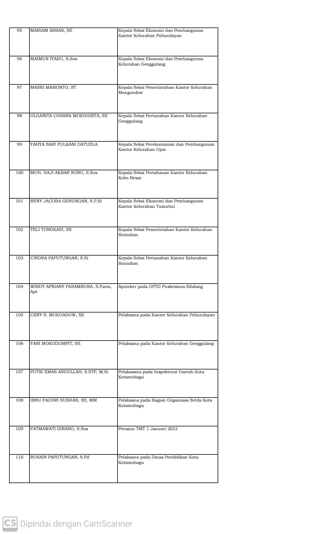 Inilah Daftar Lengkap Pejabat Eselon 4 Baru Dilantik Walikota Kotamobagu 10 Desember 2021oleh deden syaidin-981 Dilihatoleh deden syaidin Kotamobagu – Inilah daftar lengkap Nama-Nama Pejabat Eselon 4, yang baru dilantik Walikota Kotamobagu Tatong Bara, di aula Kantor Walikota Kotamobagu, Jumat 10 Desember 2021. Berikut daftarnya: Post Views: 981 Jangan LewatkanNeon Box Rusak, Kadinkes Touna DisorotASTAGA! Oknum Guru Cabul di Kepahiang Lolos PPPKProyek Puskesmas Buntu Limbong Tersendat, Tukang Andalkan Air HujanKomisi III DPR RI Buka Fakta Gelap Kasus Dana Syariah IndonesiaEkonomi Kotamobagu Tumbuh 6,02 Persen