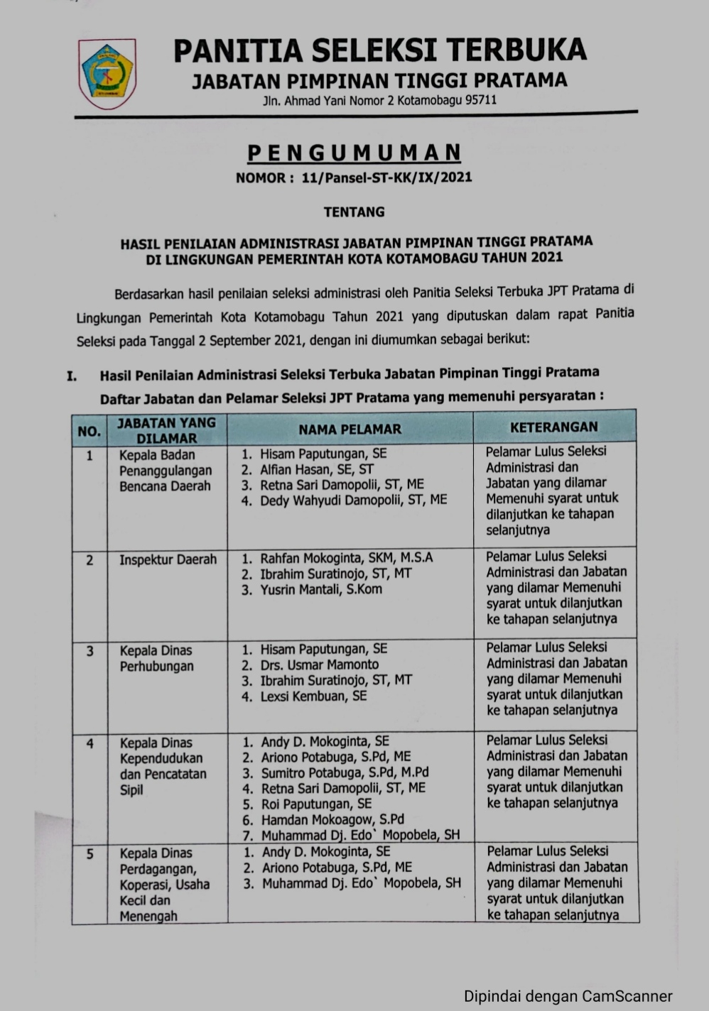 Inilah Hasil Penilaian Administrasi Seleksi Jabatan di Kotamobagu 3 September 202120 September 2021oleh deden syaidin-302 Dilihatoleh deden syaidin Pemerintah Kotamobagu mengeluarkan hasil penilaian administrasi seleksi Jabatan Pimpinan Tinggi Pratama (JPT Pratama) Kotamobagu, Jumat, 3 September 2021. Berikut edarannya yang ditandatangani Sekretaris Daerah Kotamobagu, Sande Dodo. Post Views: 302 Jangan LewatkanMantan Direktur RSIA Kasih Fatimah Resmi Jadi Tersangka Kasus Dugaan MalpraktikTok! PN Kotamobagu Putuskan Tiga Penjual Minol Ilegal Bersalah, Seluruh Babuk Akan DimusnahkanBREAKING NEWS: Kebakaran Hebat Landa Perumahan Griya di Desa Mapanget, TalawaanKejari Touna Musnahkan Barang Bukti Narkoba dan Kasus Umum, Tegaskan Komitmen Berantas KejahatanPolres Kotamobagu Tegaskan Tindak Tambang Ilegal di Lobong