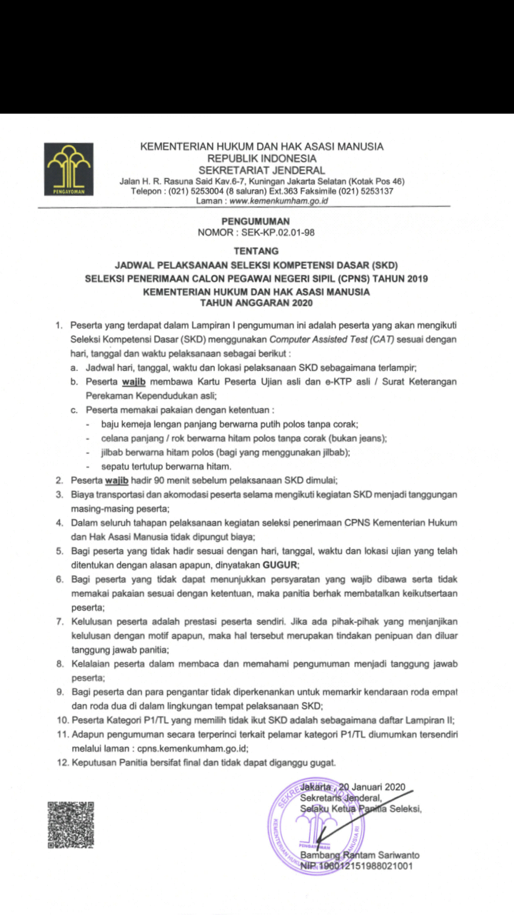 Sulut- Kementerian Hukum dan Hak Asasi Manusia tahun anggaran 2020, telah mengeluarkan pengumuman jadwal Pelaksanaan Seleksi Kompetensi Dasar (SKD) Seleksi Penerimaan Calon Pegawai Negeri Sipil (CPNS) Tahun 2019 Dengan Nomor SEK-KP.02.01-98.