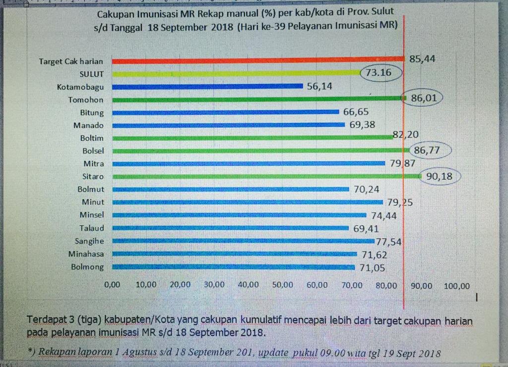 Berikut data cakupan Imunisasi Vaksin MR se-Sulut hingga 18 September 2018 :